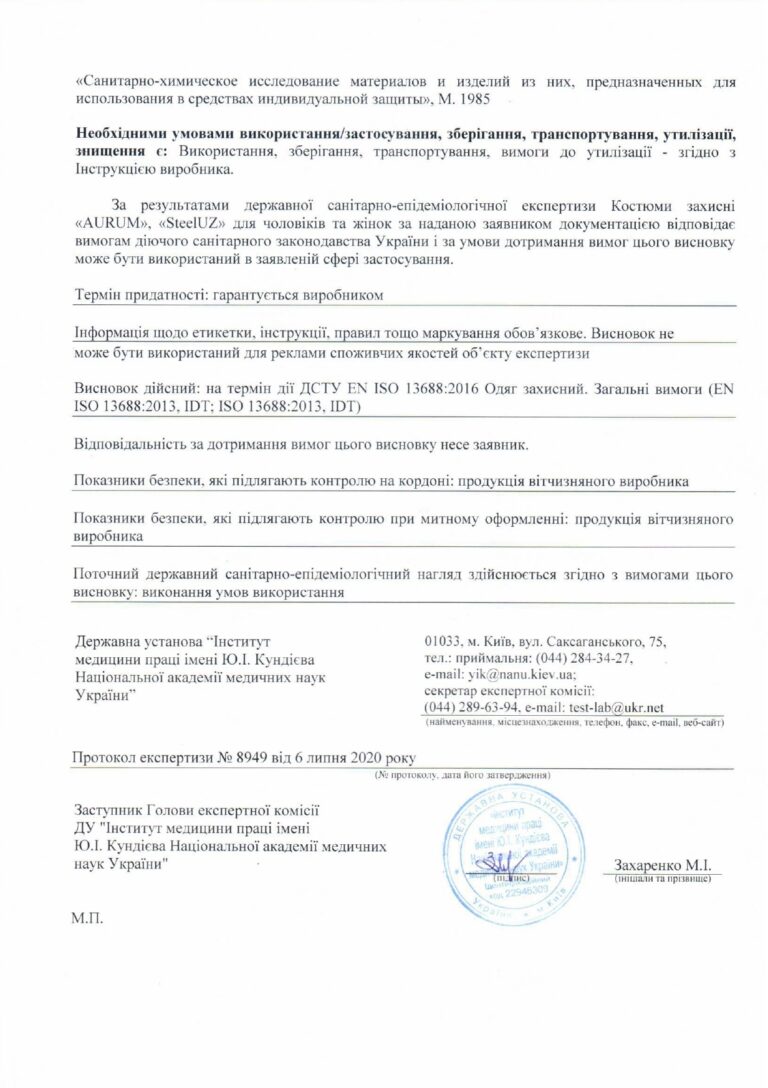 The armpit ventilation zone, adjustable by twisted zipper, allows thermoregulation during work. Sewing flexure on the back provides the freedom of hand movement and extra comfort.